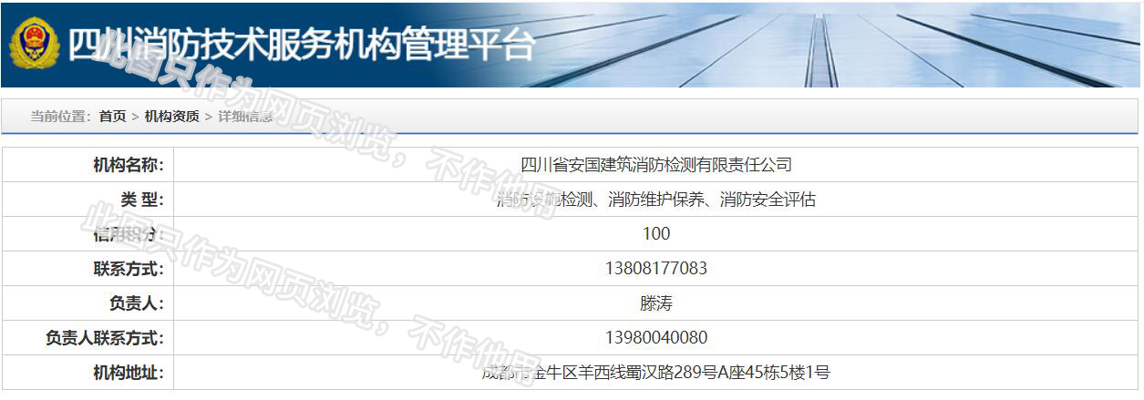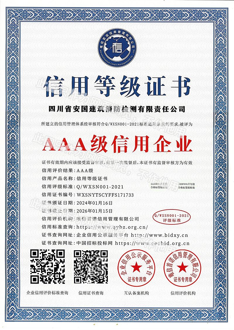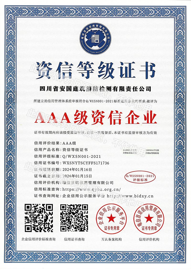 四川省安國建筑消防檢測(cè)有限責(zé)任公司,成立于1998年,經(jīng)四川省公安消防總隊(duì)批準(zhǔn),工商部門注冊(cè)的獨(dú)立法人單位。 公司具有建筑消防設(shè)施檢測(cè)、電氣防火安全檢測(cè)、維修、保養(yǎng)及技術(shù)咨詢一級(jí)資質(zhì)的中介技術(shù)服務(wù)機(jī)構(gòu),獲得CMA計(jì)量認(rèn)證。主要業(yè)務(wù)范圍是:接受建設(shè)單位或有關(guān)單位委托,承擔(dān)新建、改建、擴(kuò)建建筑自動(dòng)消防設(shè)施技術(shù)檢測(cè)、電氣防火安全檢測(cè)、以及承接建筑消防設(shè)施維護(hù)保養(yǎng),對(duì)已交付使用的建設(shè)消防設(shè)施的運(yùn)行情況進(jìn)行運(yùn)行檢測(cè),開展建筑消防設(shè)施的消防安全技術(shù)咨詢。公司設(shè)辦公室、總工辦、財(cái)務(wù)部、檢測(cè)部、維保部等職能機(jī)構(gòu),擁有一